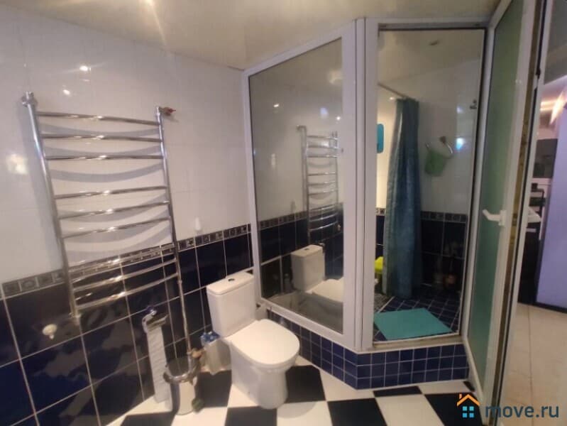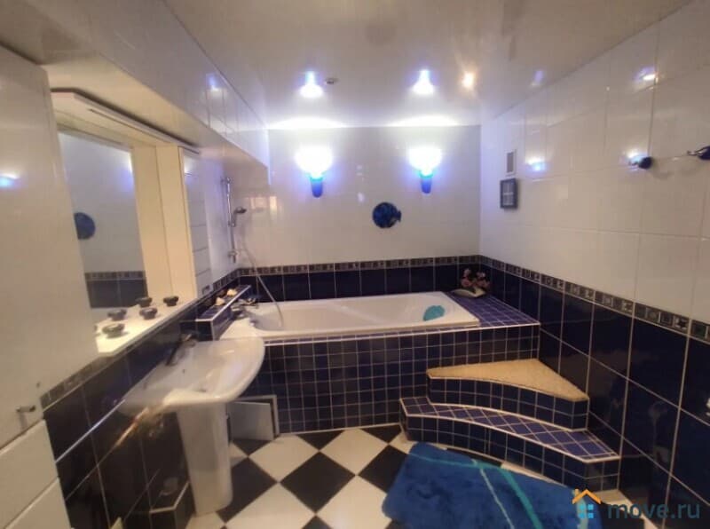 Совмещенных санузел: Просторный санузел с ванной и современной душевой кабиной.
