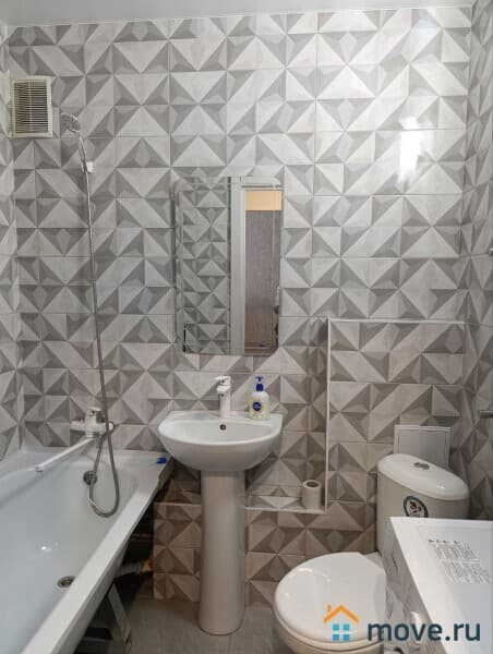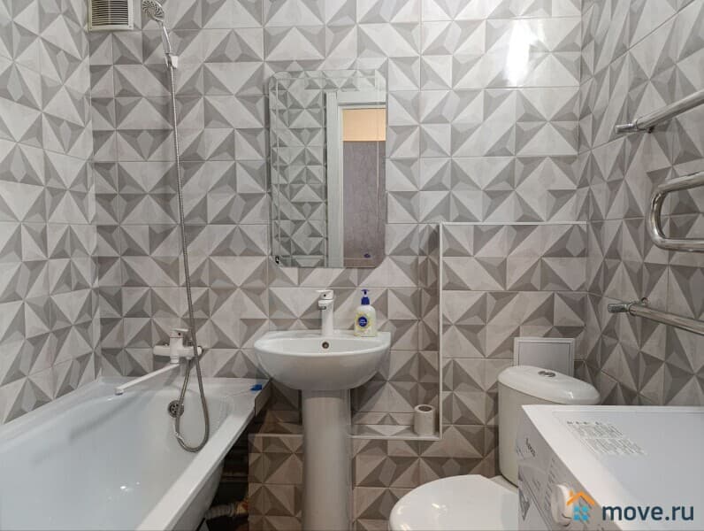 ? Современный санузел: Ванная, стиральная машина, туалетные принадлежности и фен – все для вашего комфорта и безупречного внешнего вида.